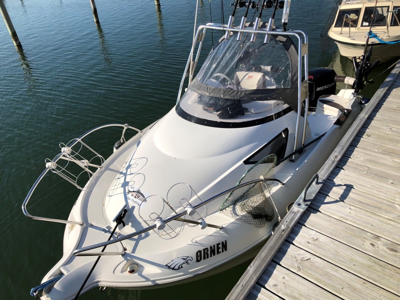 Kl. 10.05 gled Ørnen ud af havnen. Der var dog stadig rimeligt store bølger, så dagens strategi var at afsejle bananen fra syd først for derefter at gå mod Kondomet. Vi ville så se om det var muligt derfra at gå mod Møllerne. Kort før Kondomet ville vi skifte agn og kunne konstatere, at vi havde fanget en lille havørred (under målet), men fisk var det da, selvom vi ikke havde registreret noget som helst under trollingen. Ud med den igen den lille stakkel og andre blink kom på. Nu skulle vi da fange noget....