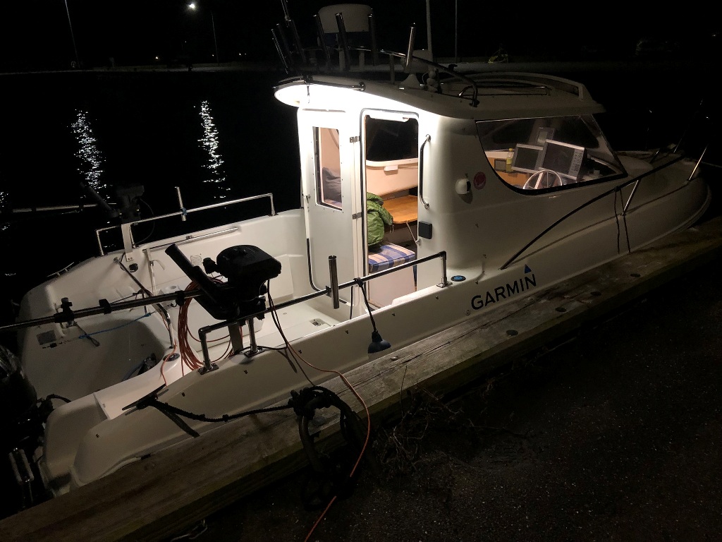 Nu skulle jeg endelig prøve den nye Ørn for alvor. Kursen blev sat mod Klintholm havn fredag ved 20-tiden og jeg var i havnen kl. 22.30. Det var mørkt og blæste mere end jeg havde regnet med fra Syd. Jeg valgte det slæbestedet i den nordlige ende, da der var lys, selvom grusunderlaget så miserabelt ud efter de sidste par storme. Det gik fint med at få båden i, selvom min fjernbetjening ikke havde det så godt og svigtede adskillige gange, men så var det jo godt, at der sidder en knap på spillet der kan få båden op og i.