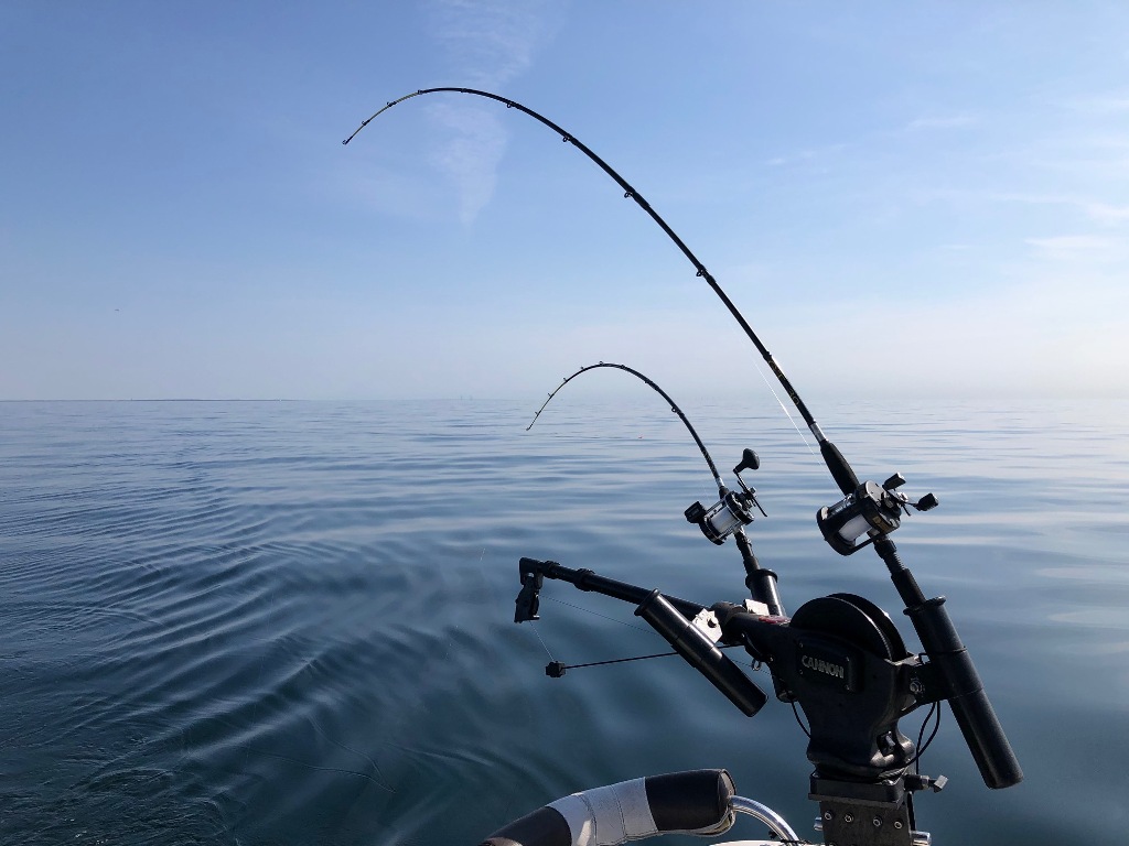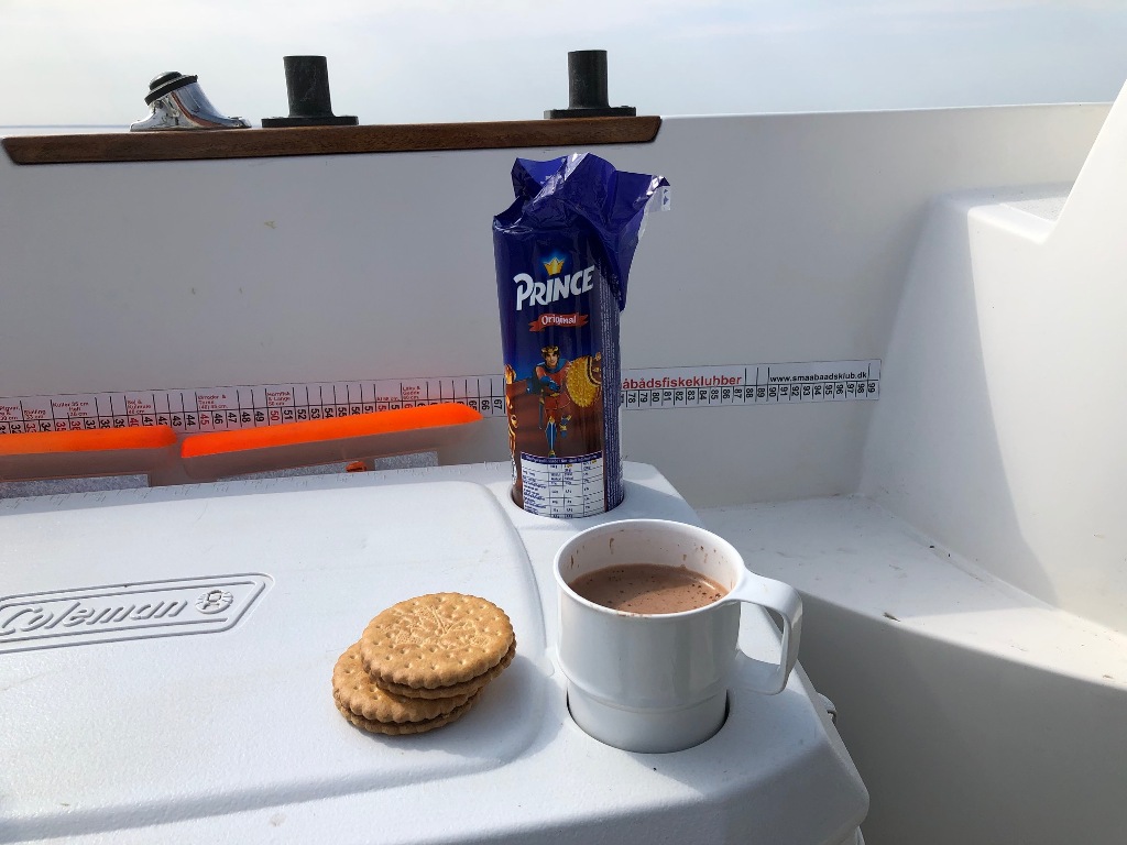 Vores plan var at sejle mod den sydvestlige kyst af Sverige for at se om vi ikke kunne stikke næsen mod Trelleborg. Vi ville jo gerne se om vi ikke kunne nappe en laks alligevel, når nu vi ikke kunne komme til vores foretrukne fiskespot med udgang fra Møn. Jeg måtte kaptitulere efter 40 min. sejlads med en snitfart på 23 knob med min lille båd, da bølgehøjden blev for meget. Jeg ved af erfaring, at jeg har svært ved at styre alle stænger samtidig med at jeg skal styre båden, når jeg ikke har en gast med. Jeg havde også konstateret, at min VHF ikke kunne sende, men kun modtage. Jeg ringede Tony op på telefonen i stedte og meldte, at jeg ville gå nordpå igen og affiske den nordlige del af bugten i stedet. Her var der fuldstændig havblik. Lidt mærkeligt at man kun skal sejle så kort strækning for at finde roligt vand.