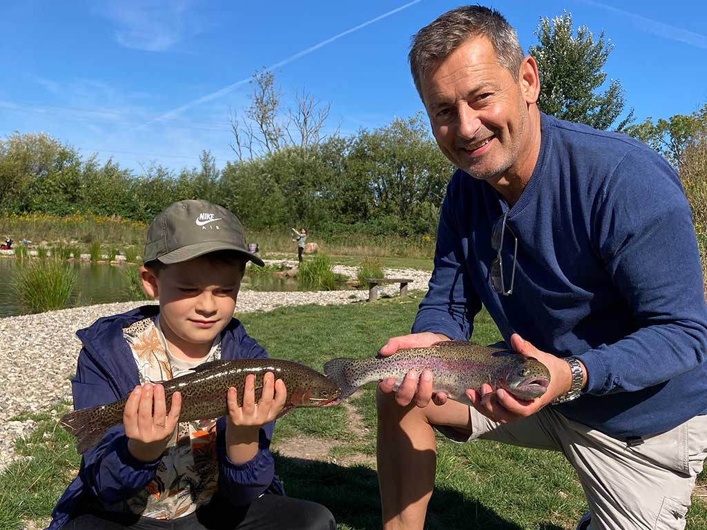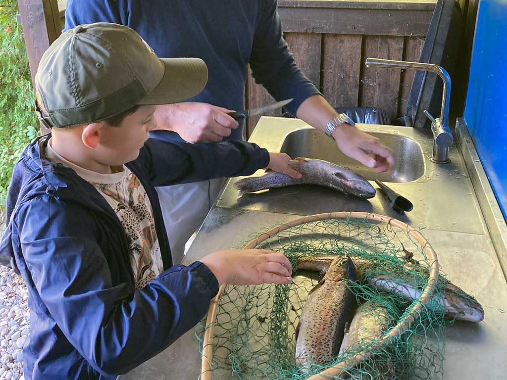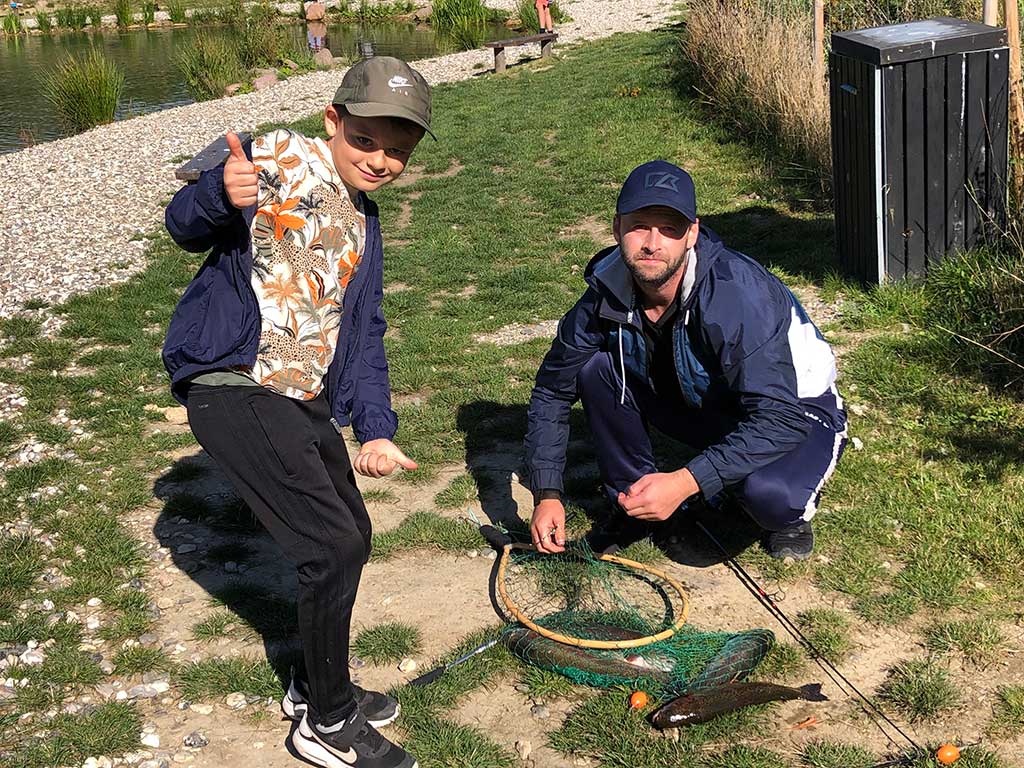 Det er mindst 15 år siden jeg sidst har været i en Put and Take, men det var faktisk mægtig underholdende og så er der jo næsten garanti for fangst! For en gangs skyld var rollerne byttet lidt om og Marc (min søn) var hjælper for William og mig i børnesøen. Rimelig underholdende og der var mange fisk i søen og heldig (dygtig), som William er, fangede han 2 pæne regnbuer og søreme om ikke også jeg gjorde. 4 fisk på fem kvarter og så var det slut.