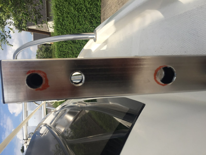 Vel ankommet til hjemmet skulle den straks monteres, desværre var der en lille konstruktionsfejl i beslagene i bunden, da hullerne der skulle gå ned over monteringsboltene var forskudt i forhold til den position hvor de skulle have været (se billede med de røde markeringer, hvor boltene ramte, når man lukkede beslaget) - ØV! Jeg måtte efterfølgende indkøbe en del ekstra værktøj for at kunne få fikset denne fejl (bore og skære), så targabøjlen kunne lukke helt ned på dækket. Efter korrektion virker den fint og jeg er meget glad for den.